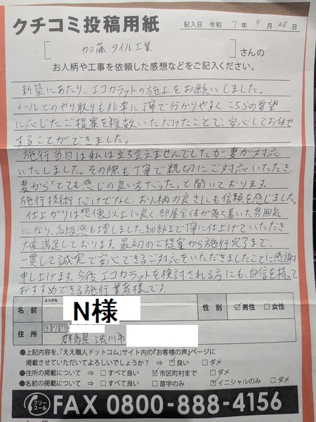 お人柄も良く、施工技術も素晴らしい加藤様に出会うことができて本当に良かったです。