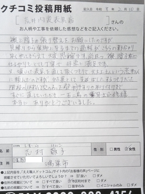 荒井内装表具店(あらいないそうひょうぐてん)の口コミ・お客様の声