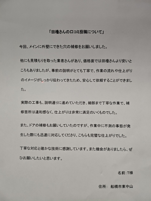 他にも見積もりを取った業者さんがあり、価格面では田櫓さんより安いところもありましたが、事前の説明がとても丁寧で、作業の流れや仕上がりのイメージがしっかり伝わってきたため、安心して依頼することができました。