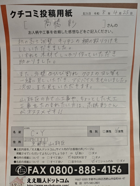 山科区の方で小工事や、ちょっとした大工工事をたのまれたい方は、高橋彰さんがオススメです!!