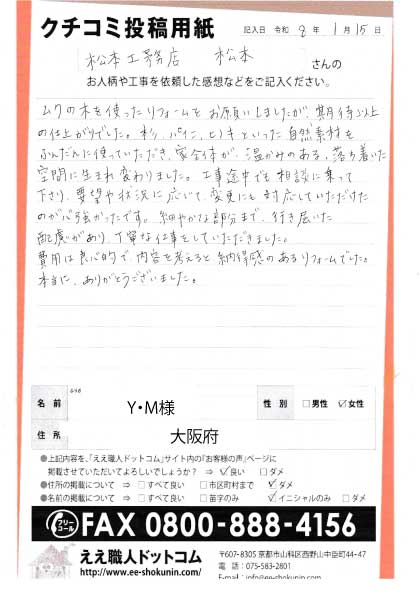 ムクの木を使ったリフォームをお願いしましたが、期待以上の仕上がりでした。