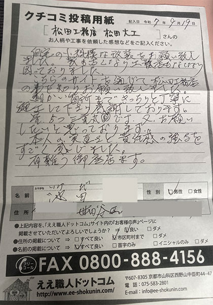 何かあったら今後もええ職人ドットコムに依頼したいと思います。