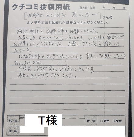 お若くても、きちんとされていらっしゃり、しっかりと最後までお仕事をしていただきました。お宮のできばえも満足しております。