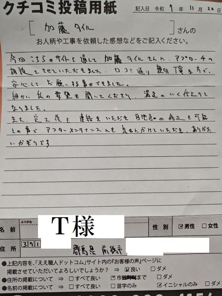 お人柄も良く、施工技術も素晴らしい加藤様に出会うことができて本当に良かったです。