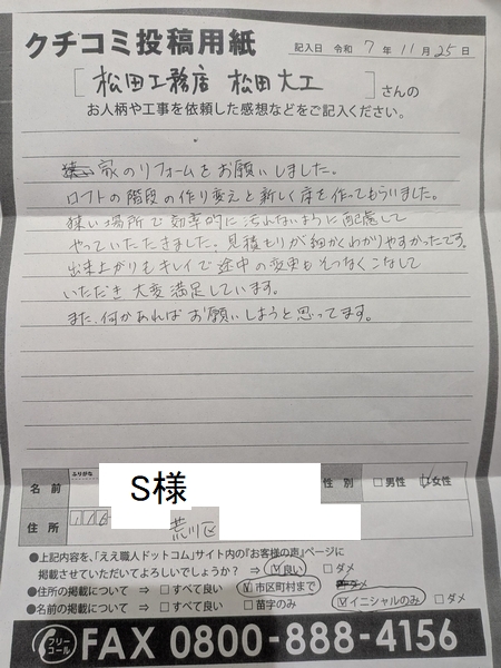 今後もリフォーム・修理の時は、まずは松田さんに相談させていただきたいと思います。