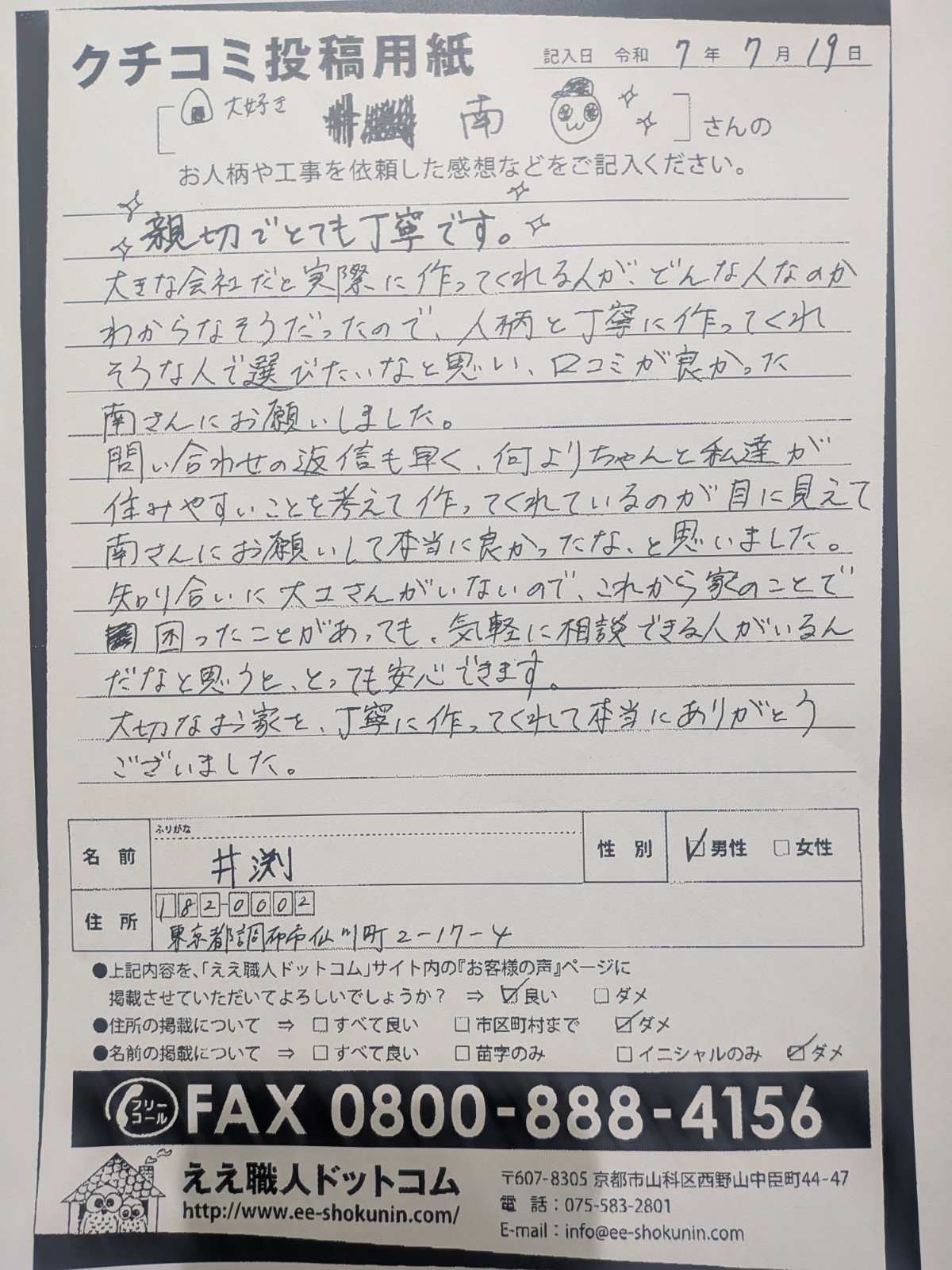 高齢の母がおり工事中もいくつかわがままをお願いしましたがこちらの事情に合わせて下さり、とてもありがたかったです。もし、また家のことで何かありましたら南さん、たよりにしております。他のみなさんにもお勧めしたい職人さんです。
