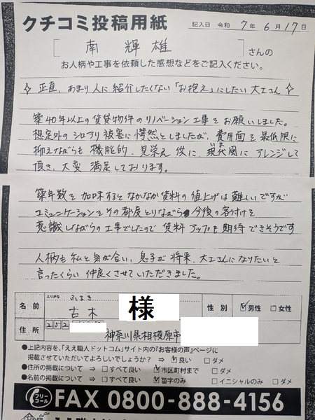 昨年10月から今年3月まで5ヶ月間にわたり数々のアドバイスや打ち合わせ等親身になって下さり工事も無事に終わり南さんには感謝の気持ちでいっぱいです。