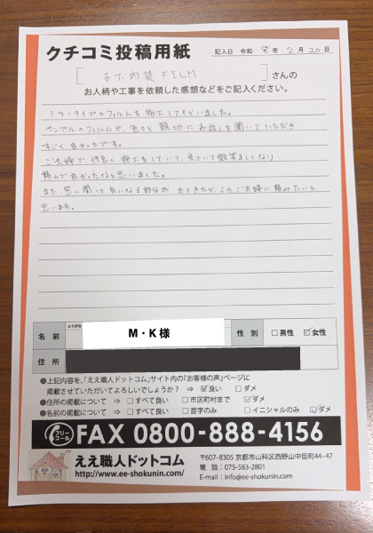 サンプルのフィルムや、色々と親切にお話しを聞いていただき、すごく良かったです。