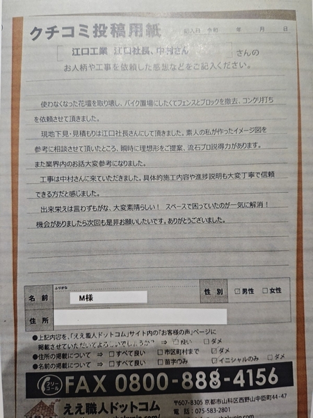 使わなくなった花壇を取り壊し、バイク置場にしたくてフェンスとブロックを撤去、コンクリ打ちを依頼させて頂きました。