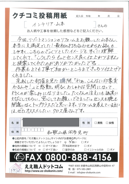 今回、リゾートマンションのリフ ォームをお願いした山本さん、本当に大満足でした!