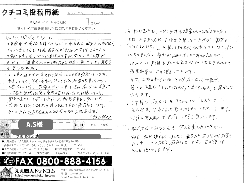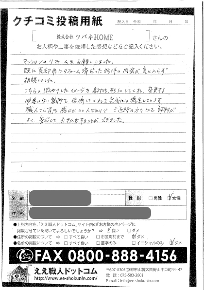 ツバキHOMEさんに依頼して良かったです。